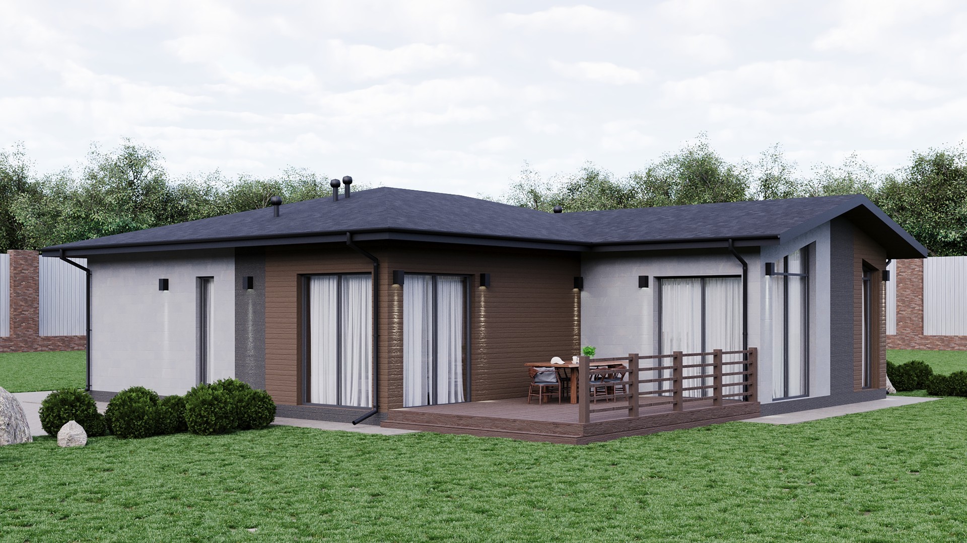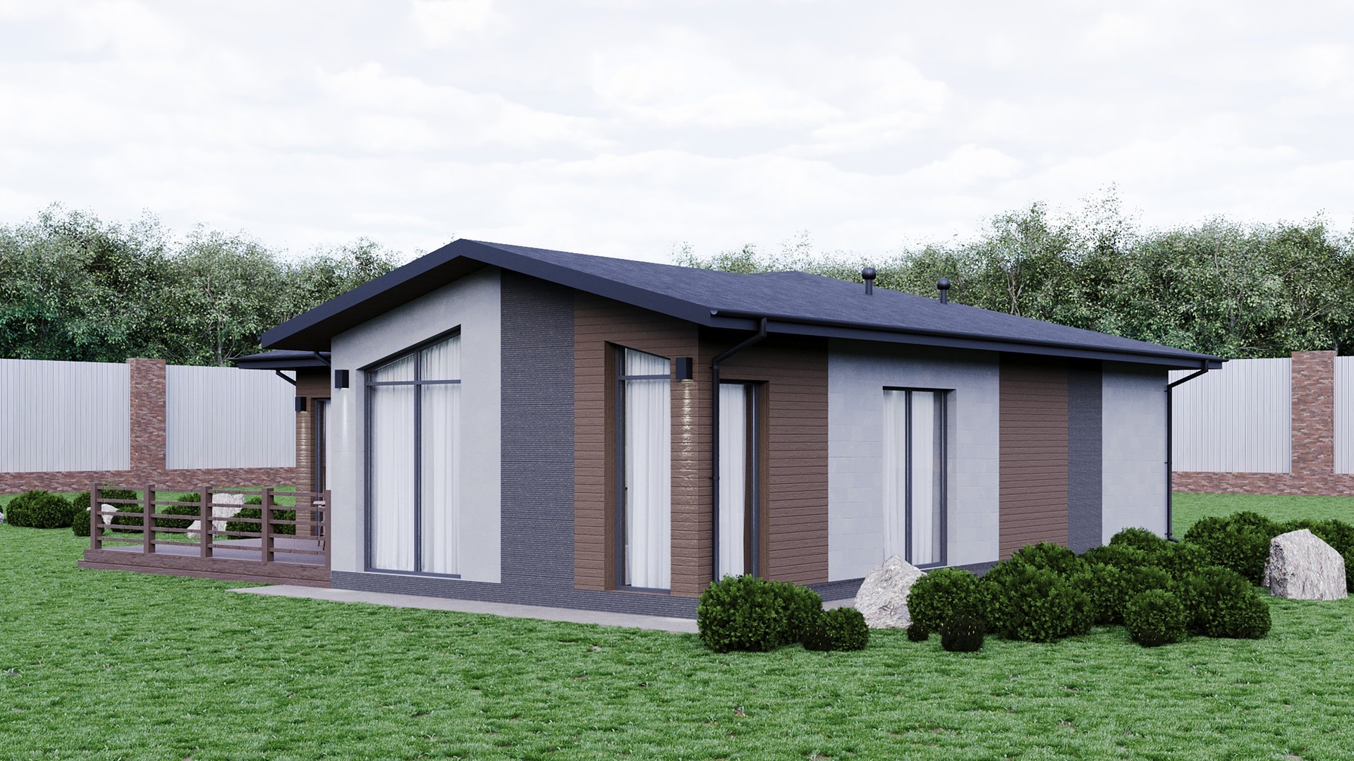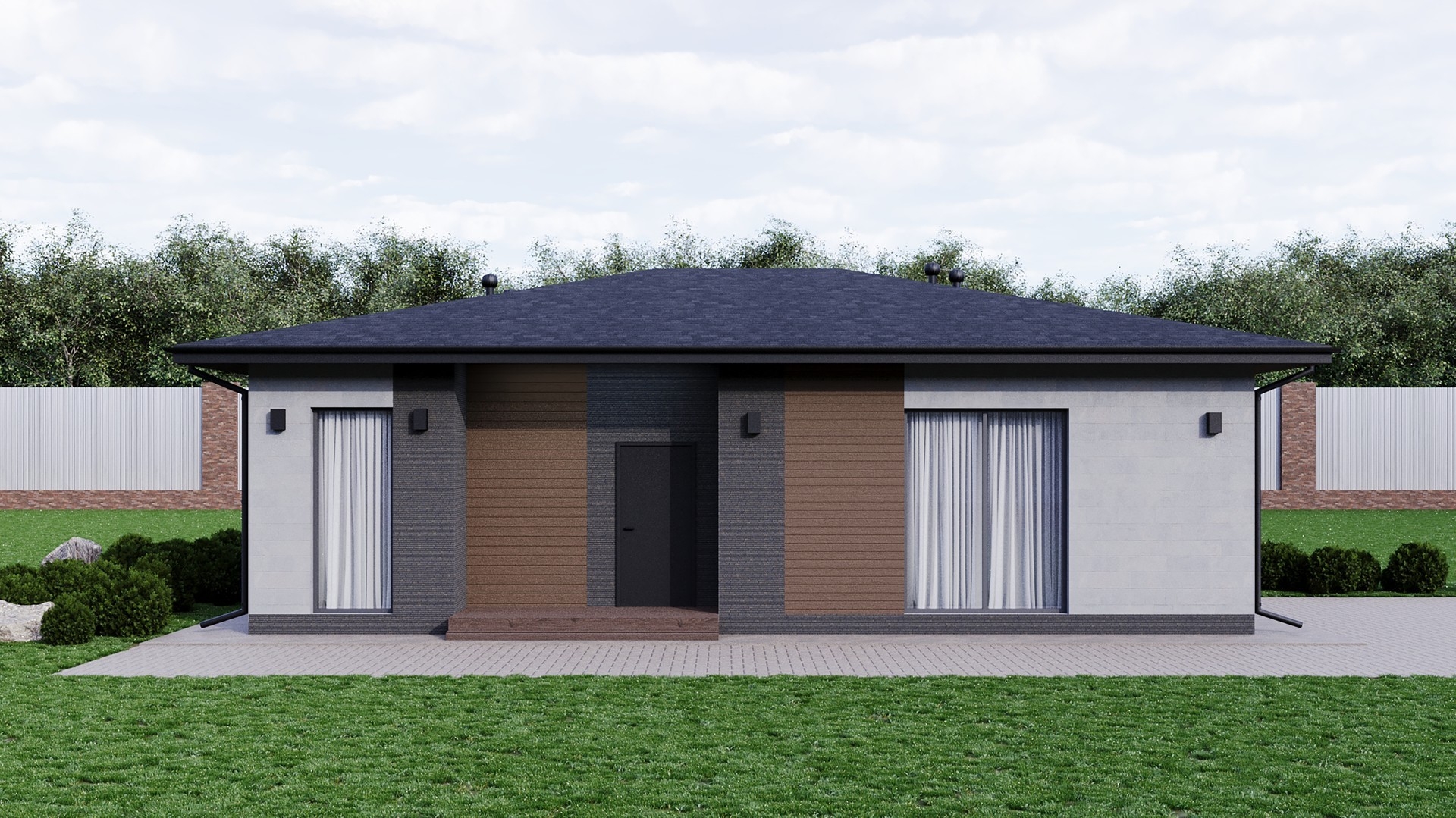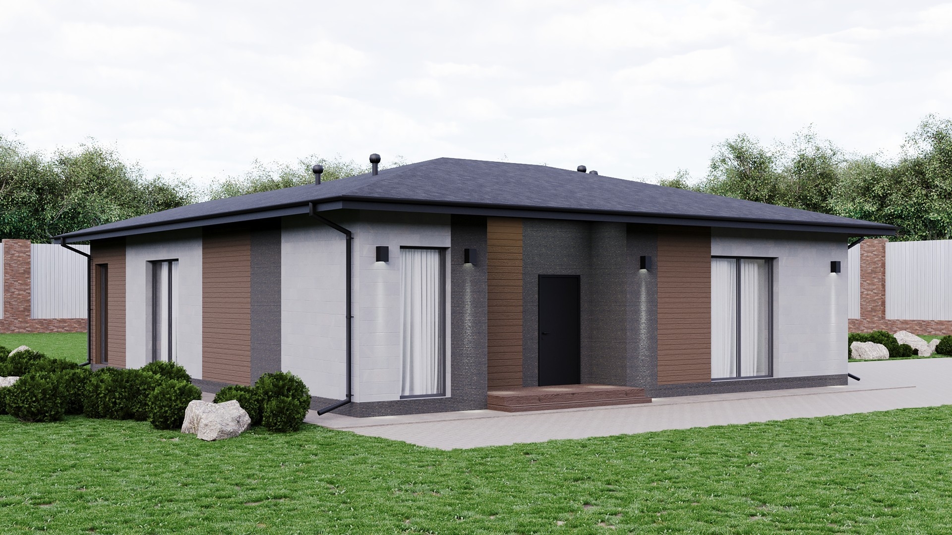 Этот современный одноэтажный дом идеально сочетает визуальный простор и функциональность. Центром проекта стала светлая кухня-гостиная с увеличенной высотой потолков и панорамным остеклением, создающим ощущение абсолютной свободы. Планировка включает две уютные спальни и проработанную систему хранения: три гардеробные и отдельная постирочная позволяют легко поддерживать идеальный порядок. Техническое помещение спроектировано с учетом требований для подключения газа, что гарантирует комфорт и экономичность эксплуатации. Рациональное решение для тех, кто ценит эстетику света и продуманный до мелочей быт.